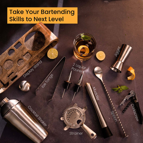 Stand Out with Style: Elevate your home bar with the stylish bamboo wood stand included in the set. It not only adds a touch of elegance but also keeps your tools organized and ready for action, perfect for creating an impression in front of friends and family.