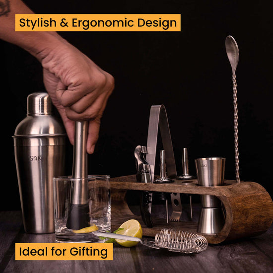 Get ready to shake, stir, and shine like a star with the SAKI Home Decor Stainless Steel Bar Tool Set with Stand - your ultimate ticket to becoming the life of the party!